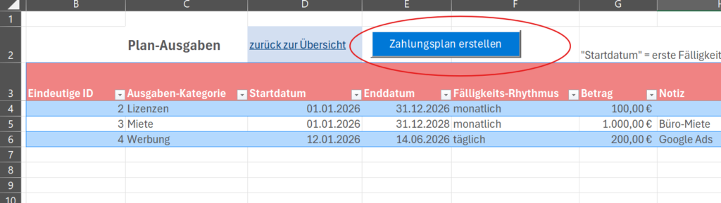 In einer vorgefertigten Vorlage erfassen Sie Ihre Ausgaben. Regelmäßige Ausgaben – egal ob täglich, monatlich, wöchentlich, vierteljährlich, halbjährlich oder jährlich, müssen nur ein Mal erfasst werden und werden automatisch für alle Perioden brechnet.